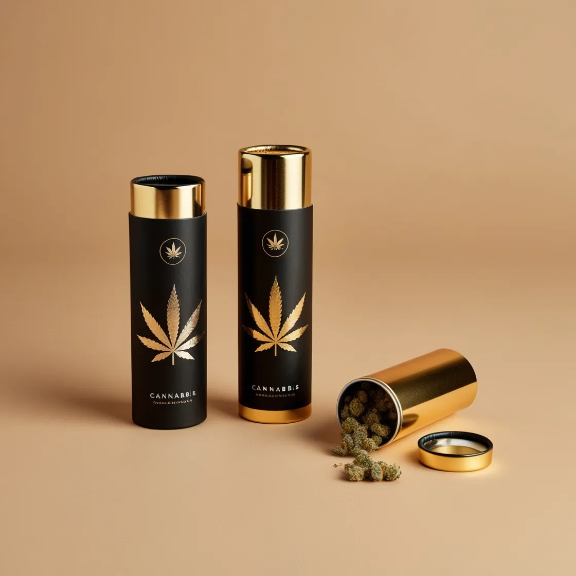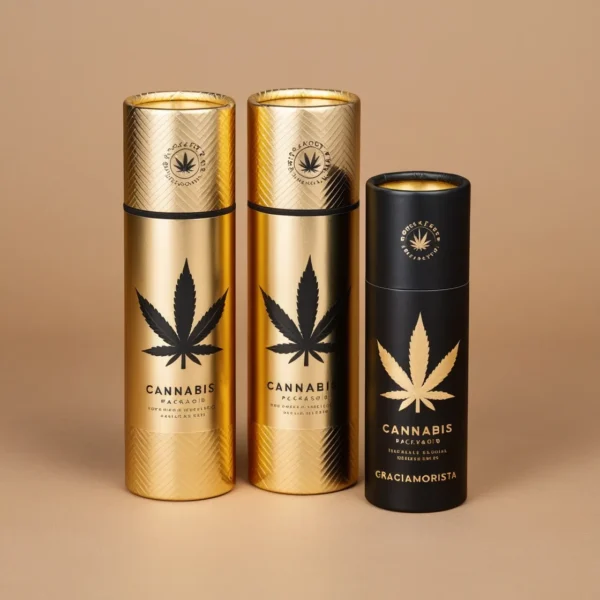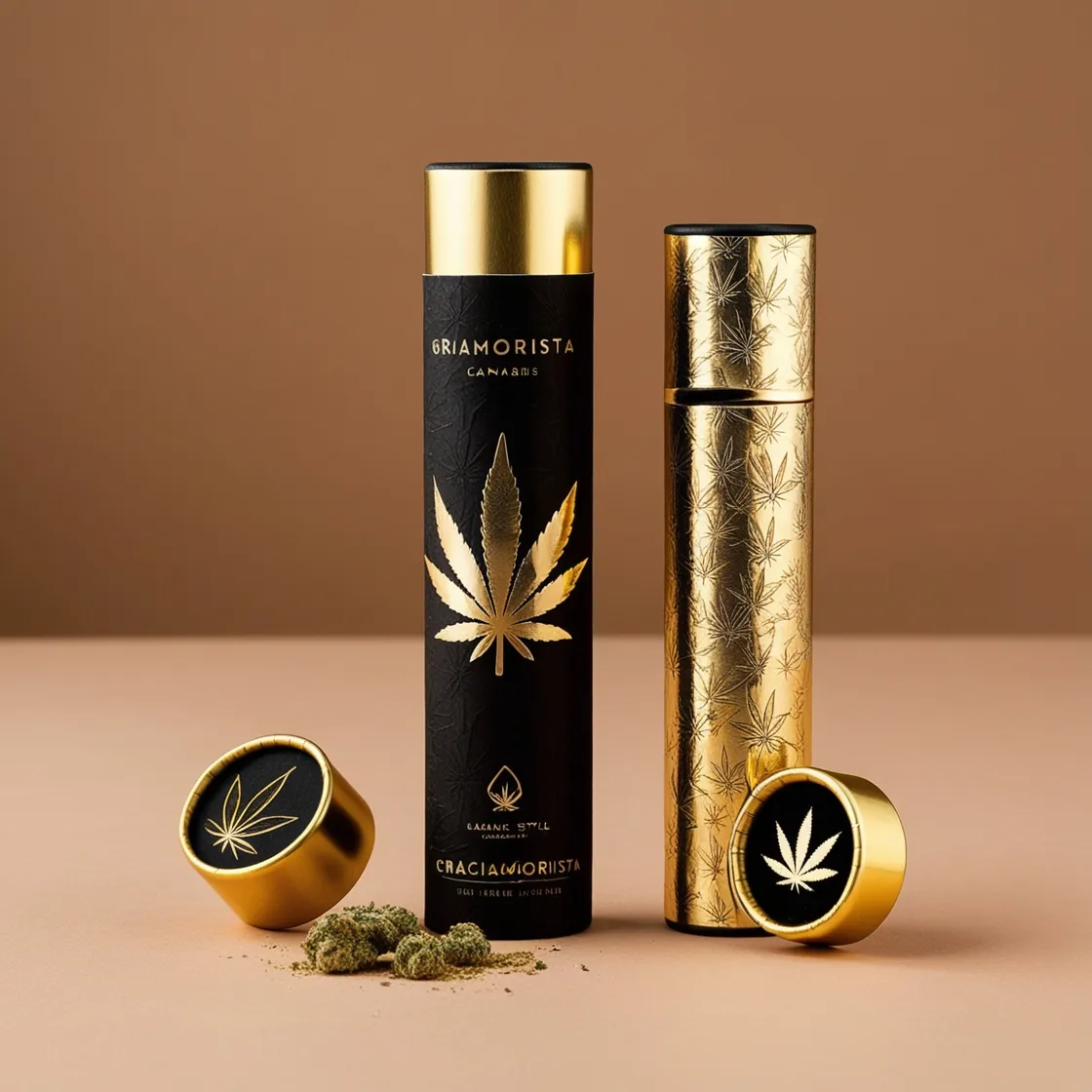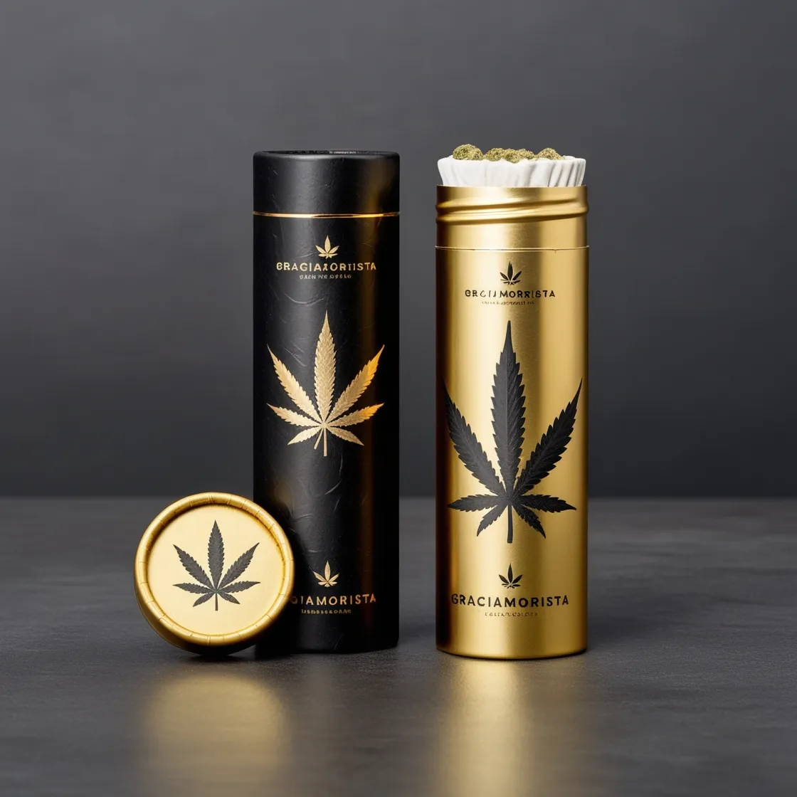 The Graciamorista black and gold paper tube cannabis packaging exemplifies luxury and sophistication. Designed with high-quality, durable materials, this packaging is both eco-friendly and recyclable, reflecting the brand’s commitment to sustainability. The striking black and gold color scheme with a matte finish exudes elegance, while the metallic textures add a touch of opulence. A refined cannabis leaf icon, presented with precision, enhances the luxurious aesthetic. The Graciamorista brand name is prominently featured in an elegant, metallic font, ensuring it stands out. Detailed product information, including strain, weight, THC/CBD content, and recyclable material symbols, is clearly displayed on the sides. Combining portability with high-end design, this packaging is perfect for the modern, discerning consumer.